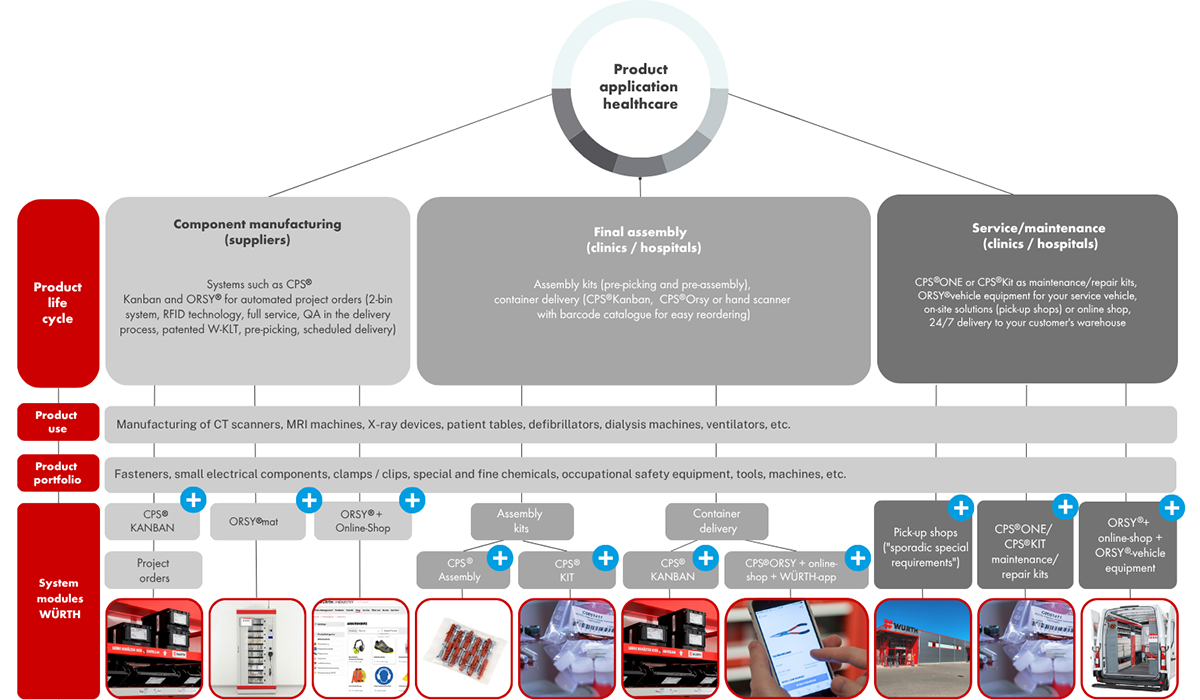 With Würth Industry Service, you benefit from advanced technologies in diagnostics, therapy, and IT solutions, as well as comprehensive full-service C-parts management for your medical devices. Our mission is to ensure optimal and timely supply through customized solutions and state-of-the-art technologies—support that could be vital for your patients. Specifically, we offer the medical industry: