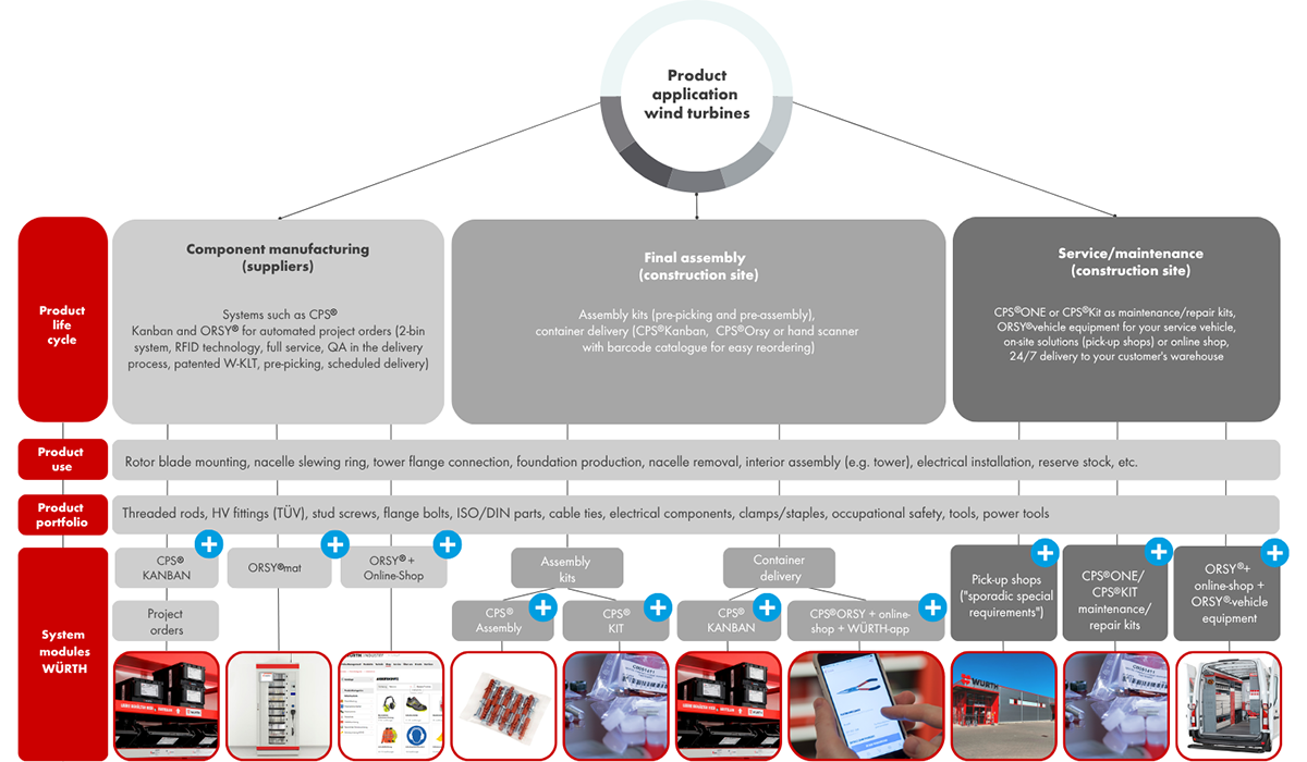 With CPS®NEW ENERGY from Würth Industry Service, you have a reliable partner whose product portfolio includes corrosion-resistant DIN and standard parts and tools that are suitable for use in wind turbines and the related installations, as well as systems with which you can automate and decentralise your material procurement in production and construction. Whether for component production, final assembly or maintenance of wind turbines - we have the right products for you!